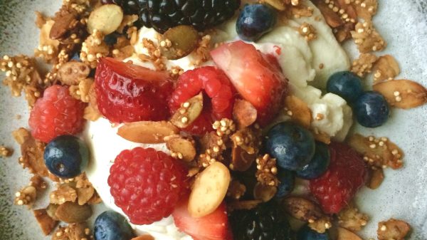 - Pre-heat the oven to 325 degrees F. Combine the sesame seeds and sliced almonds in a large mixing bowl. Place the honey in a microwave safe bowl or cup and microwave for 30 seconds (or heat in a small pot until hot). Add the hot honey to the bowl, along with the vanilla, salt and butter. Stir until combined and the other ingredients are well coated. The hot honey will also melt the butter.